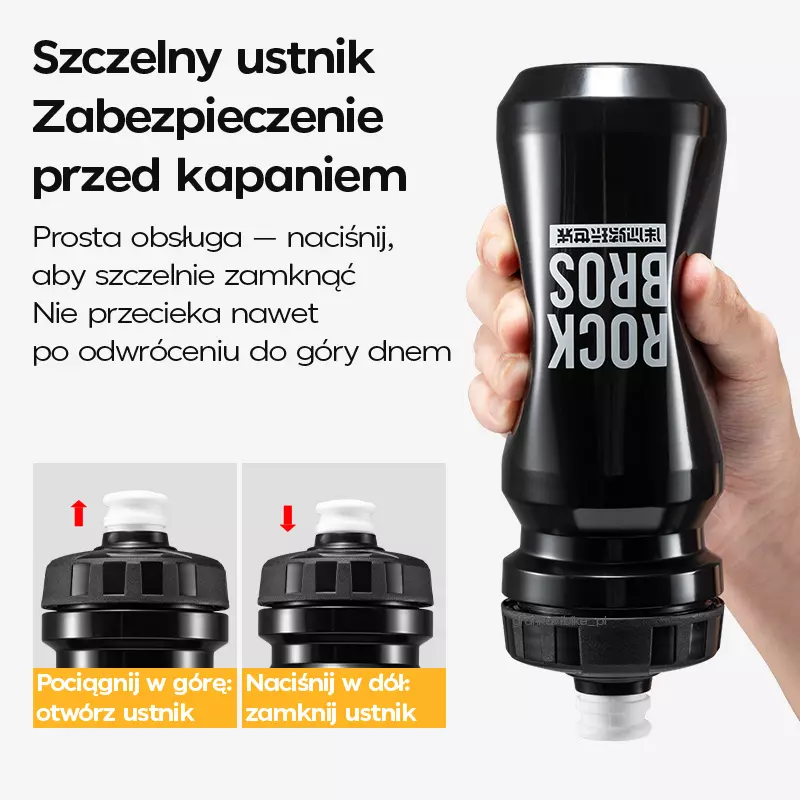 - W 100% szczelny ustnik otwierany jednym naciśnięciem – brak wycieków nawet po odwróceniu bidonu